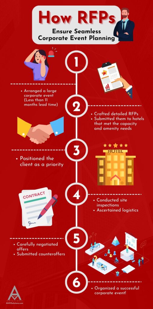 In conjunction with RFPs, swift site inspections, and adept negotiation skills will ensure seamless corporate event planning despite tight timelines.